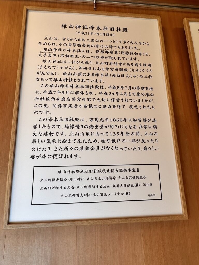 1995年(平成7年)に135年ぶりに建て替えられた雄山山頂の雄山神社・峰本社の旧社殿が復元されました