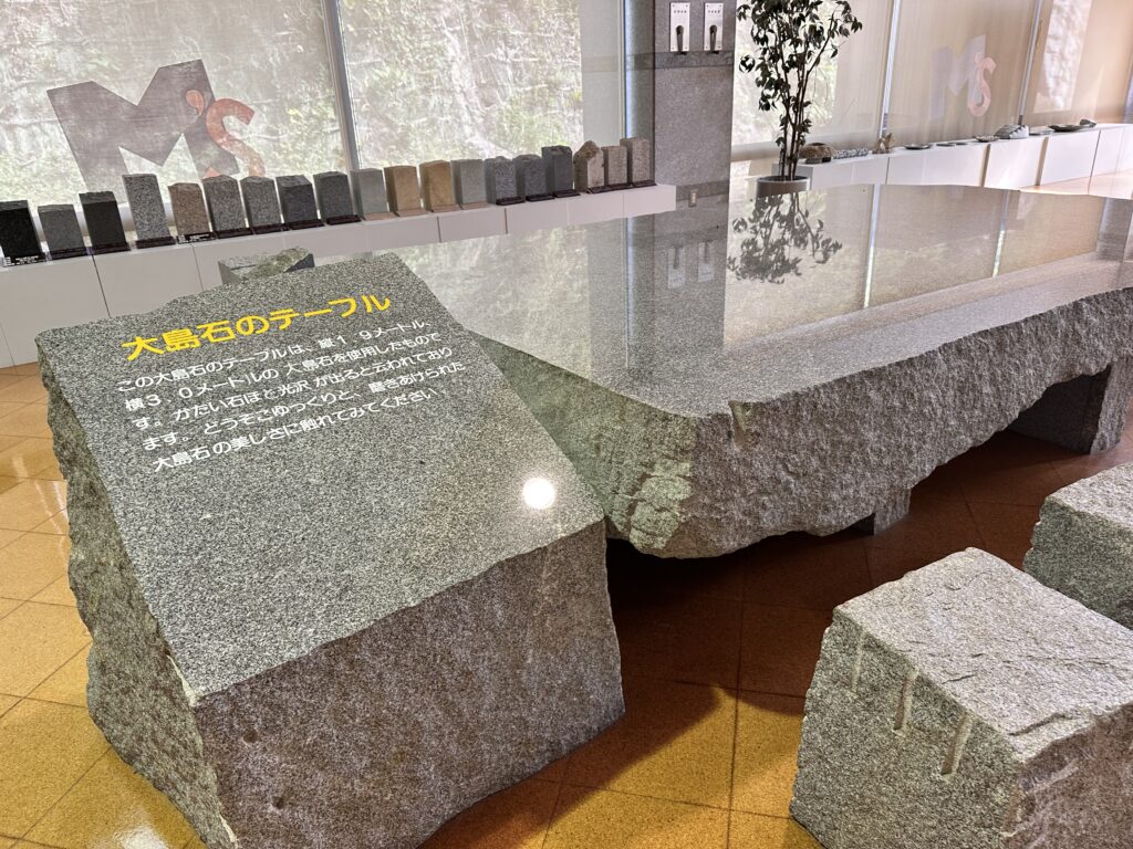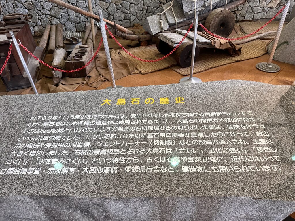 大島石は主に墓石に使用されていますが、国会議事堂や赤坂璃宮にも使われています。耐久性に優れており、経年変化に強く、色の目が均一で美しい等の特徴があります(愛媛グリーンツーリズム)より