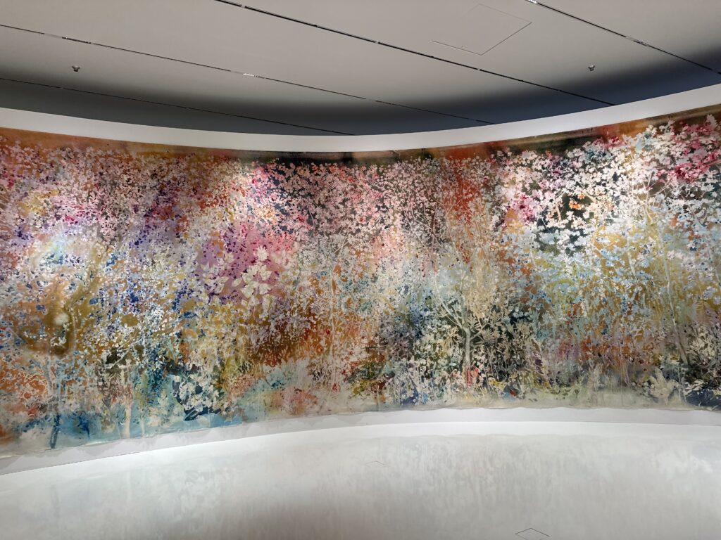 巨大なキャンバスに植物を置きその上から色鮮やかな染料をまく技法でおよそ1年かけて作られました作品