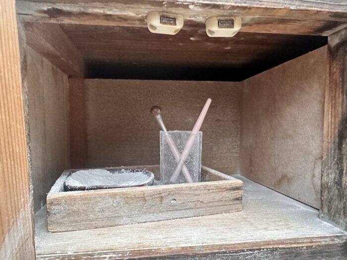 こたえ。。。お地蔵様の下に『おしろい筆セット』があります
